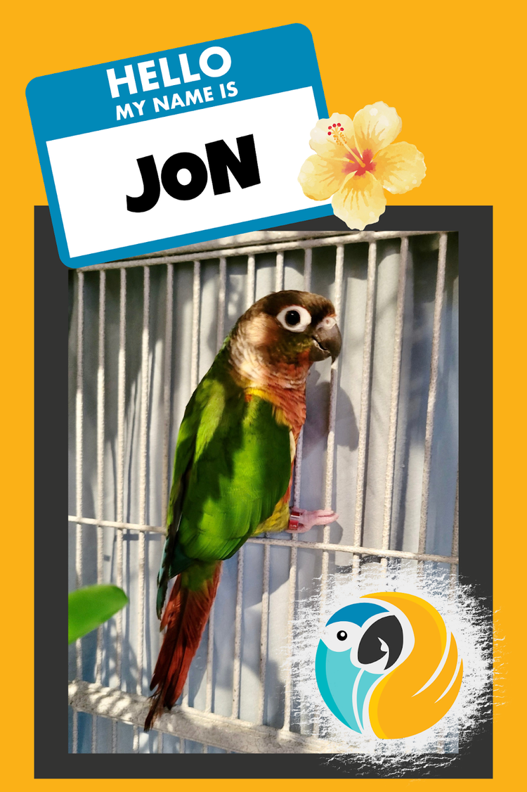 NOTE: Jon does not come with a cage of his own, so his adoptive family will need to supply one that is clean and of an appropriate size for conures (32” wide x 23” deep, with ½” to ¾” bar spacing). Please do not purchase a cage before you are approved to adopt Jon; we list the minimum size in order for you to get an idea of how much you may need to invest in a cage.