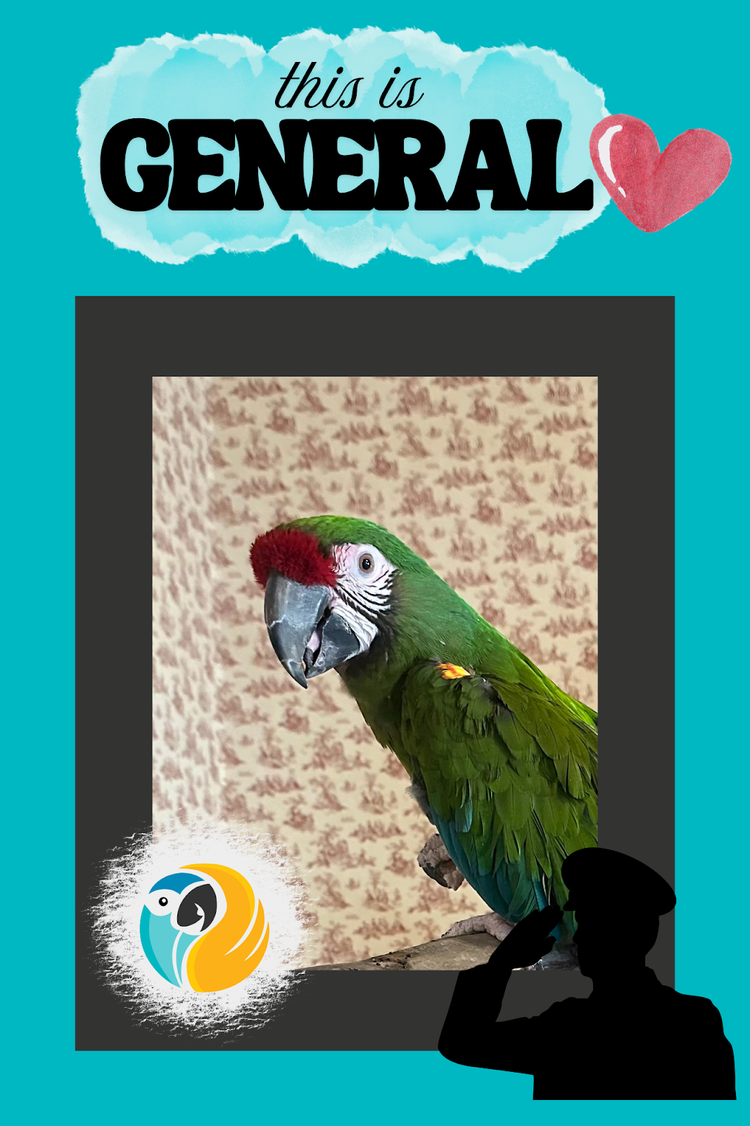Attention! Is there anything more fitting than a military macaw named General? A few times a day, General will have something VERY LOUD to say, but otherwise the the similarities stop there. We believe General to be about 25 years old, and while we are saying “he/him” we don’t really know if he is male or female. At one point in his life, General had been dearly loved and carefully cared for, but through no fault of his own, he came to us after being neglected for some time when his owner began experiencing health and aging difficulties. Military macaws sometimes have a bad reputation for being a difficult or aggressive species, but General’s foster family has found him to be the complete opposite!
